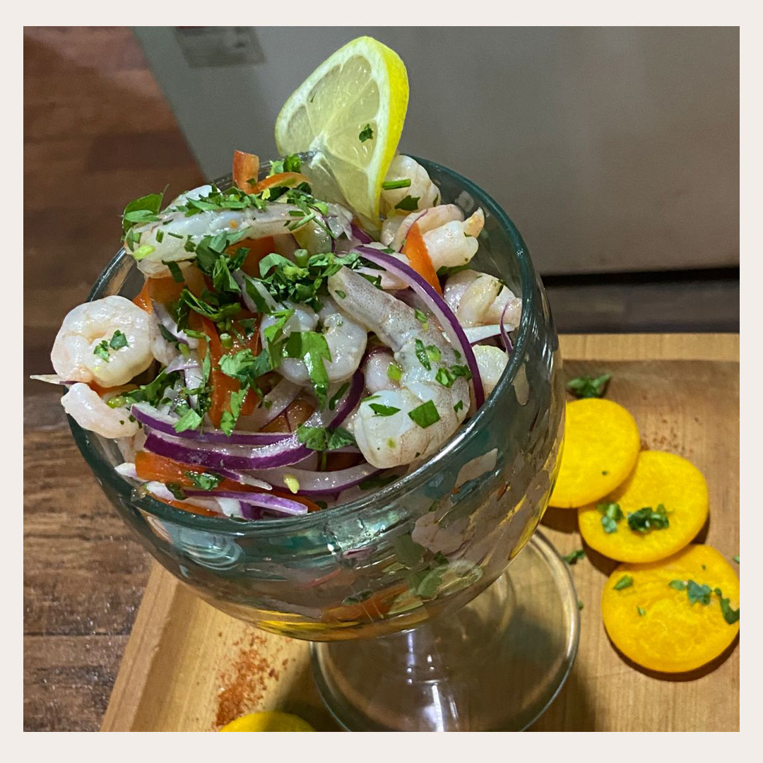 CAMARONES, PIMIENTOS ROJOS, VERDES, CEBOLLA, CILANTRO, PALTA EN CUBITOS, LIMONETA, ACOMPAÑADO DE SOPAIPILLAS