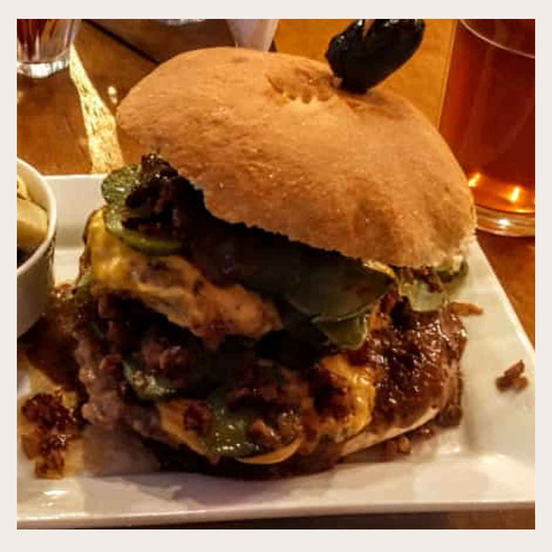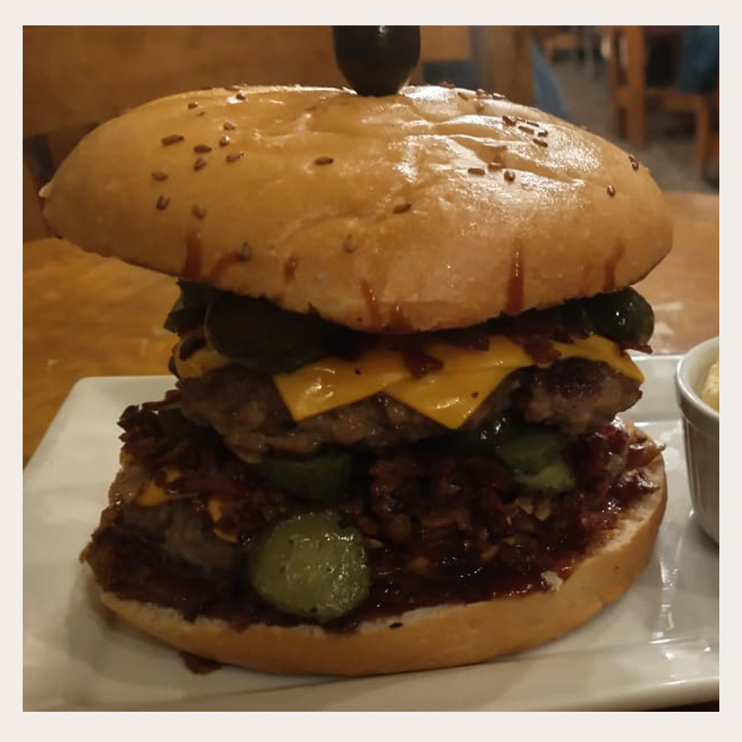 HAMBURGUESA DOBLE CARNE CON DOBLE CHEDDAR, DOBLE TOCINO, PEPINILLO DILL, ANILLOS DE CEBOLLA Y SALSA BARBACOA DE LA CASA.